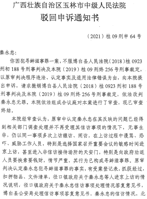 令村民们始料未及的是,维权之路未通,牢狱之灾先至。2017年,秦永忠因多次进京信访被立案侦查,2019年被博白县法院以寻衅滋事罪判处刑罚。法院认定其“在信访问题已获处理的情况下,仍多次缠访闹访,向政府劝返工作人员强拿硬要钱财,情节严重”。但这份判决,却在事实认定与司法程序上布满漏洞合法信访变“寻衅滋事”?“花钱劝返”反成定罪依据